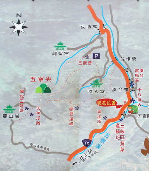 走7乙往三民方向.五寮國小前100公尺有指標往龍山巌右轉上山可達.