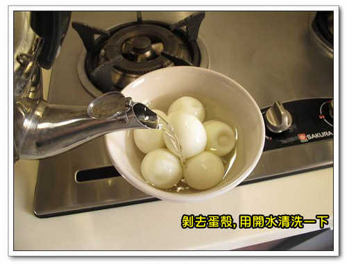 蛋溫冷了之後把蛋殼敲裂,再放回水中。等久一點會讓水滲透入殼,這樣蛋殼會容易撥開。