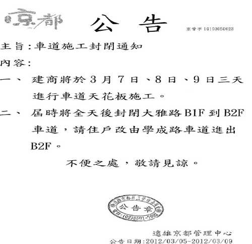 (訂正)封閉大雅路車道 公告 3/7/2012(三)~3/16/2012(五)