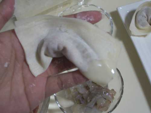 取一片餛飩皮,挖一小匙餡料,再把蝦仁放在餡料上~