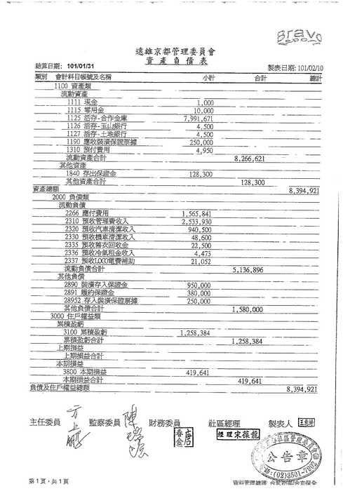 依規約規定每月報表應在次月15日前公告的.從去年9月開始到今.每月我都有要求物管會計秘書確實遵照規約辦理.據我所知.2月財報我已審核過了.本來上星期六要提報委員會通過.但委員會因出席人數不足而流會.我剛已要求會計秘書於今天公告.