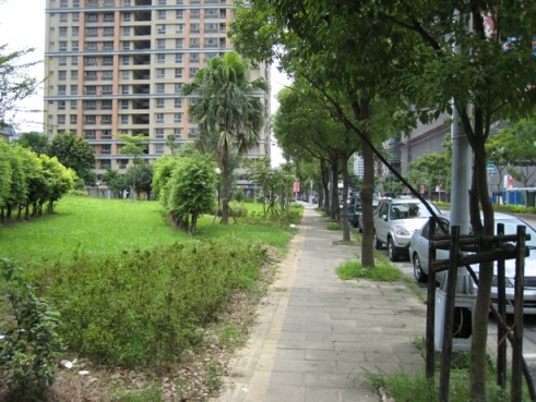 從學成路往三樹路方向看 - 建築物是有退縮, 但建築物前方被花圃, 柵欄, 鐵皮圍籬...等佔據, 行人走起來都不方便了, 更不用談規劃腳踏車道. 這一段不像北大特區該有的質感.