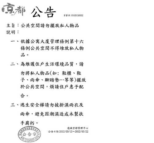 公共空間請勿擺設私人用品 公告