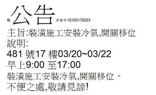 A棟481號17樓 3/20(二)~22(四) 裝潢施工 公告