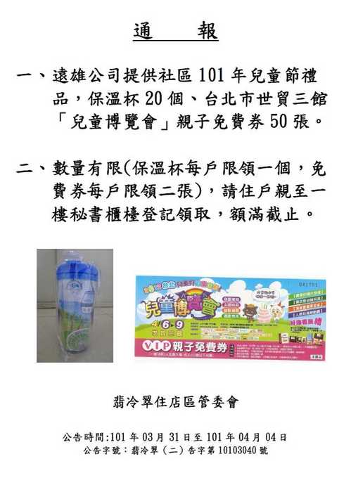附件為發放遠雄兒童節禮品