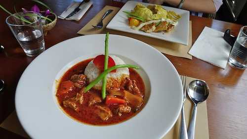綠咖哩很地道 聽老闆娘說 裡面不加ㄧ滴水 純粹是耶漿和牛奶