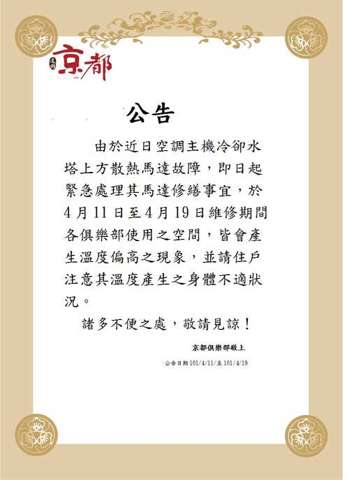 俱樂部空調主機維修 公告 4/11(三)~4/19(四)
