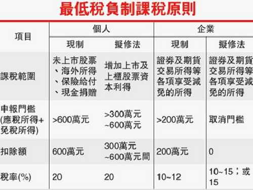 最低稅負制自民國九十五年實施後,從未修正。財政部此次將修訂「所得基本稅額條例」(即所謂的最低稅負制),在個人部分,應計入基本所得額的法定五種免稅所得中,再增加個人買賣上市及上櫃股票的資本利得,但高達六百萬元的扣除額將配套調降。公司的最低稅負基本所得額只要超過二百萬元,即要課徵百分之十的最低稅負所得稅(法定徵收率為百分之十至十二);目前規劃,將取消二百萬元的扣除額,並調高法定徵收率至百分之十五。換言之,有包括證券及期貨等免稅所得的企業,未來即需申報「最低稅負制」,適用範圍也將擴大。
