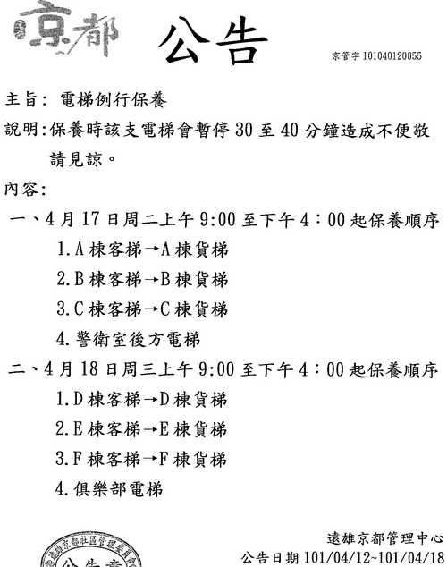 電梯例行保養 公告 4/17(二)~4/18(三)/2012