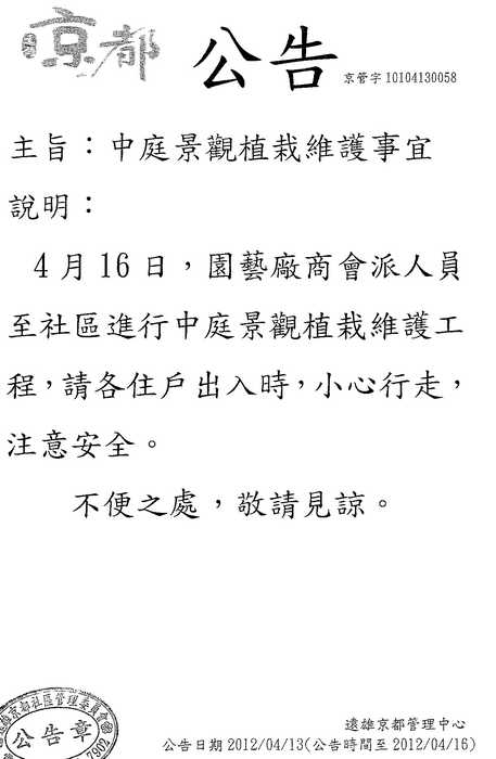 中庭園藝維護 公告 [原訂4/16(一)/2012],下雨改期