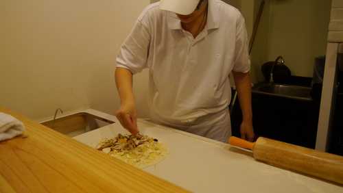 看著師傅將麵糰擀平,灑上食材,再用那大大"平匙"把麵糰送入火爐中...漸漸變膨,變金黃,