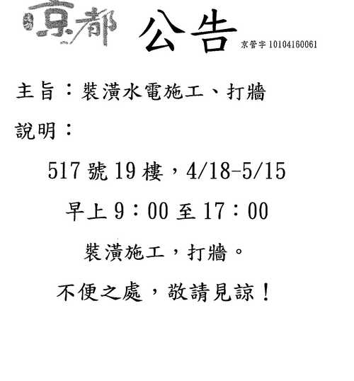 迦勒 發表於 2012-4-18 02:42 WendyLKK, 若能公告:那天和那個時段要打牆,或許比較何情合理?短短那幾個小時,我們住樓下的,可回避一 ...