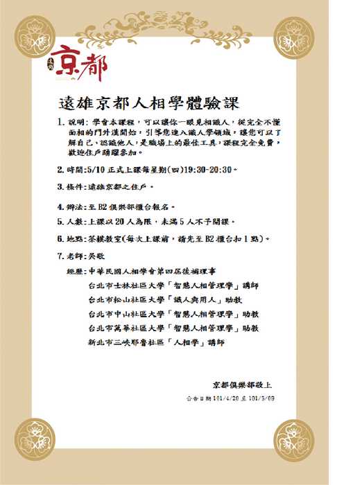 WendyLKK 發表於 2012-4-27 18:08 剛剛和芳鄰企俱管櫃檯報名了, 名額有限ㄡ!