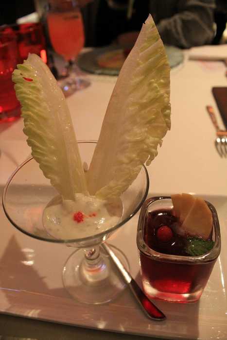 這是開胃雙重奏~~右邊的是酒凍(紅酒+萊姆汁~~+上面有放燻起司)左邊的是蘿美心+燻鮭魚塔塔醬...吃起來有種酸酸甜甜的感覺!!