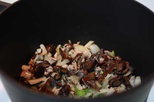 3. 放入豬絞肉,拌炒,接著放香菇.