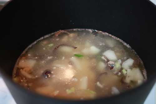 5. 淋入泡香菇的水,一點點醬油,改成大火煮到滾~