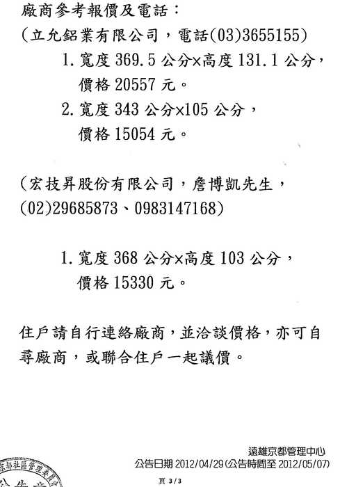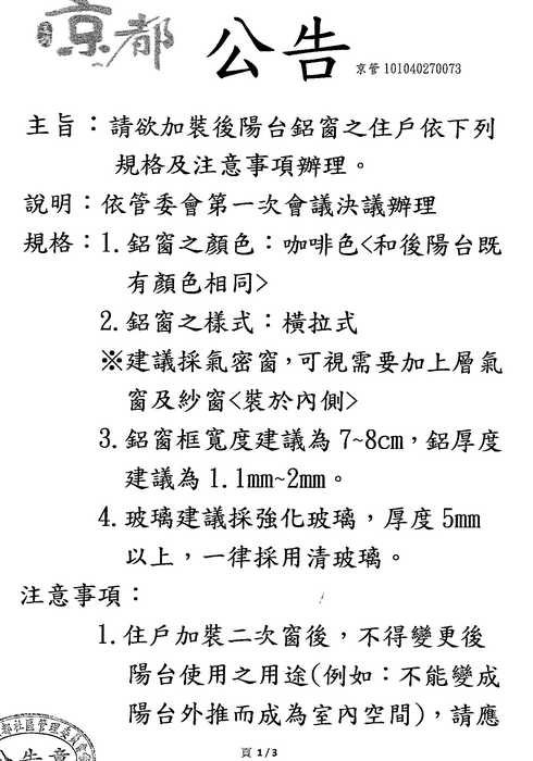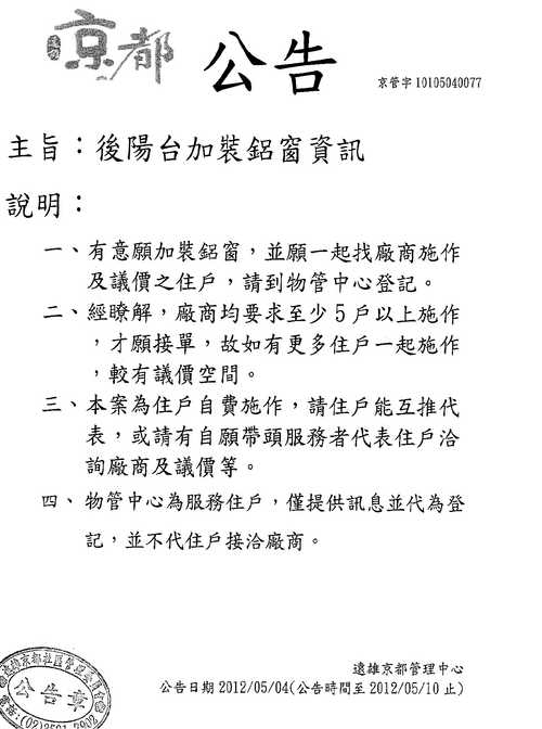 如要納入管委會討論,可能要提出理由較有說服力,而且區權會通過的是後陽台加鋁窗,授權管委會定規格及顏色,露台部份有否在授權範圍?抱歉!因我不知指何處的窗子,故無法判斷。