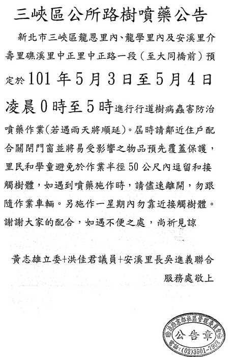 三峽區公所路樹噴藥公告 5/3(四) ~ 5/4(五) 凌晨0時~5時