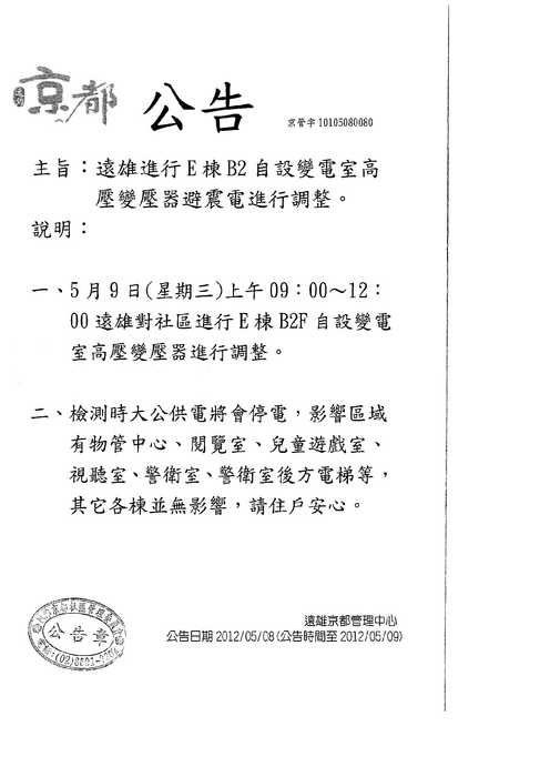 E棟B2 高壓變壓器調整公告 5/9(三)/2012 09:00~12:00 noon