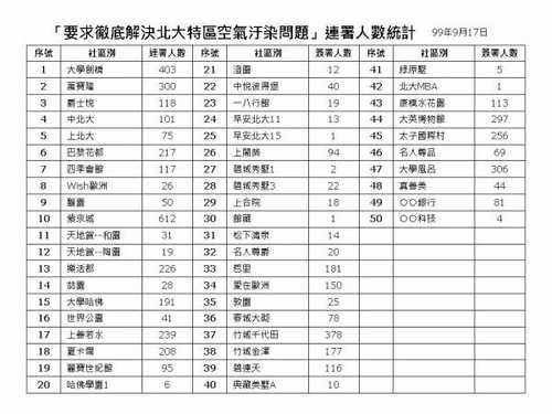 公佈截至9月17日止,各社區(含部份公司)連署人數如下: