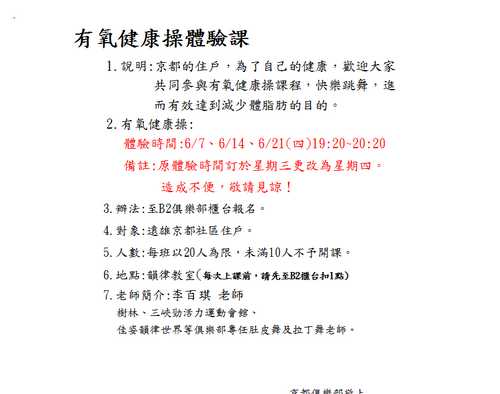[更改]有氧健康操體驗課 為星期四(原先是三) 19:20~20:20 p.m.