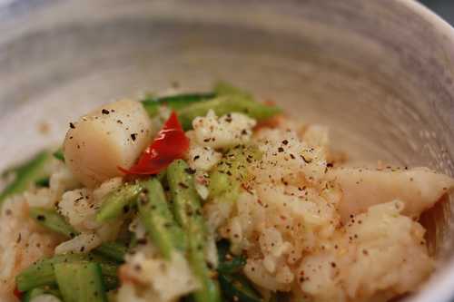 4. 爆香蒜,拌入一點xo醬,倒入生米,加熱水蓋過米,灑點鹽,大火滾.