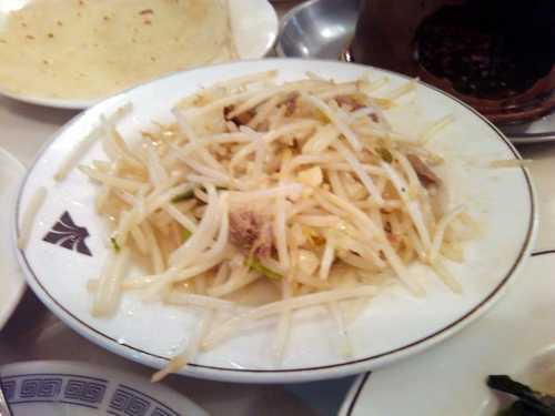 這道菜是用烤鴨剩下的碎鴨肉炒豆芽.