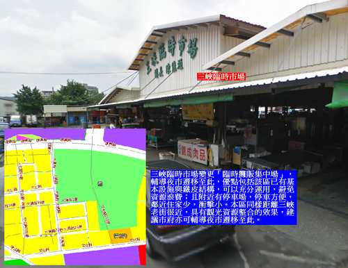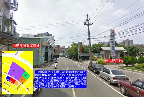 3. 三峽區國光街有停車場用地、市場用地與商業區用地,亦適合設置「臨時攤販集中場」,輔導違法夜市遷移至此,優點包括: