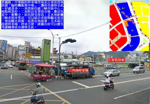 1.三峽區愛國路、中華路口「三角湧停車場」(停車場用地)以及週邊的「車站用地」,佔地遼闊,可以考慮設置「臨時攤販集中場」,輔導違法夜市遷移至此。優點包括: