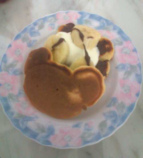 把好市多的鬆餅粉+牛奶+一顆蛋.....我很"隨意"的倒入攪拌,然後用湯匙畫出了像熊或像米老鼠的煎餅