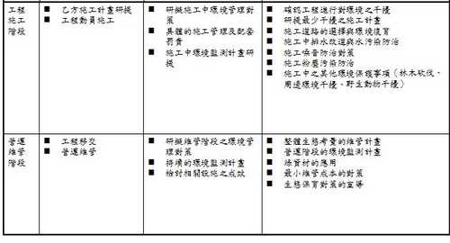 道路建設可應用生態工法,因應主客觀條件之不同,應落實個案基地生態環境調查,適地適用的提出處理對策,其各階段應分析項目整理如表1-3。