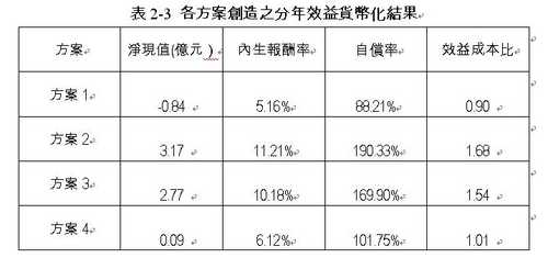 依據前述參數設定與成本、效益項目推估結果,進行經濟成本效益評估所得之淨現值、內生報酬率、自償率、效益成本比等參數彙整如表2-3所示。各方案中,以方案2淨現值達3.17億、B/C值1.68、自償率達190.33%最佳,其次為淨現值2.77億、B/C值1.54、自償率達169.90%之方案3,兩方案均具經濟可行性。方案1由於拆遷費用達6億元,故影響整體效益成本評估結果,其淨現值為四方案中唯一為負、唯一無法自償者,不具經濟可行性。經整體評估考量,建議採方案二作為後續設計依據。