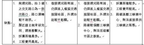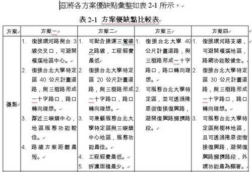 各方案土地徵收面積及建物拆遷面積統計如表2-2,其中方案二之建物拆遷面積遠低於替代方案,土地面積因需繞過既有建物,用地面積高於方案一,但低於方案三及四,因此方案二之可行性仍較替代方案為高。