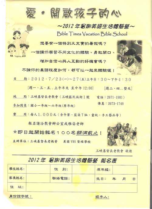 三峽基督教長老教會特與他們合辦一個暑期夏令營,服務三峽地區的小朋友