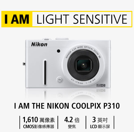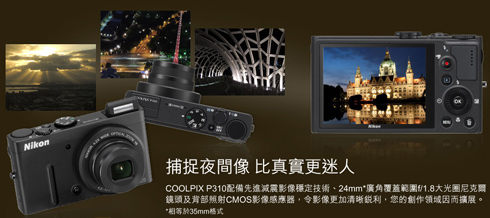COOLPIX P310配備先進減震影像穩定技術、24mm*廣角覆蓋範圍、f/1.8大光圈尼克爾鏡頭及背部照射CMOS影像感應器,令影像更加清晰銳利,您的創作領域因而擴展。