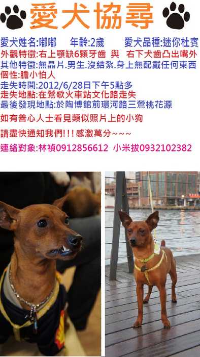 狗狗目前安置在我家,他因為體型,顏色各方面都太像我家走失ㄉ嘟嘟,從照片上看連飼主ㄉ我們都誤認ㄌ~~~