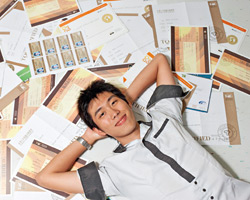 目前已握有四十六張證照的賴彥彬就印證了余光昌的說法。去年剛上大一的他,高職階段就考取四十六張證照,是當時全台高職生證照張數最多的紀錄保持人。很難相信,當初他升高中的基測成績只有一五五分。賴彥彬分享自己的考照心得表示,「第一次考照時,以為自己考不上,但後來發覺,比聯考簡單多了。」他分析,由於證照考試測驗的多半為基本常識,不像聯考,老是要出難題把考生考倒,再加上只要拿到六十分就好,壓力較小,因此只要孰稔基本題,過關絕非難事!