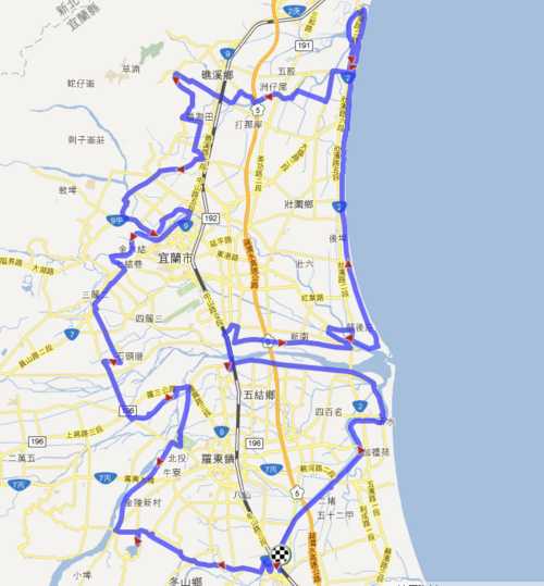 羅東運動公園→鼻子頭堤防自行車專用道→冬山河農田水利會→冬山火車站→冬山河自行道→傳統藝術中心→五結大匣門一/二號橋→蘭陽溪自行道→蘭陽大橋→雙園自行車道→貓里霧罕橋→東港濱海公園→東港自行車道→竹安溪口→得子溪自行車道→二龍競渡碼頭→林美金棗園→吳沙紀念館→蘭城橋→宜蘭磚窯廠→宜蘭橋→宜蘭河自行車道→水金一號橋→員山機堡→林家古厝→葫蘆堵自行車道→大洲車站→大洲橋→自行車道→清洲橋→羅東運動公園