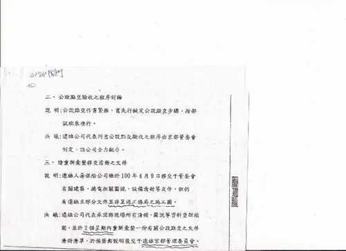 1) 第二屆管委會除了第一次會議(4/14/2012)討論了14個議題中, 沒有放入點交驗收議題外, 從第2次會議(4/28/2012)~即將召開第10次會議(9/8/2012), 就一直有[公設點交籌劃進度]議題討論; 6/30/2012 14:00下午還特別召開臨時會, 開啟與遠雄的協調會(請參閱會議紀錄, 主席確定公設點交大原則)