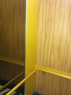 木紋面我初步也覺得抗刮能力是較差的 ( 但事實為何? 可能要試驗看看...) , 不過, 如同我在前面貼的大學風呂的電梯內照片, 一般來說, 習慣上會設置一個壓克力製公告欄在其中一側的牆面, 那一面的牆面就佔了便宜了, 有公告欄幫忙檔著, 如果公告欄設計的好看些, 也能增加美觀程度.