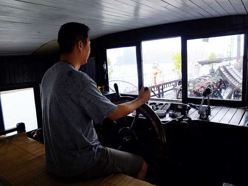 雨勢稍小, 到樓上的船長室, 船長很客氣的讓我們開船過過癮.