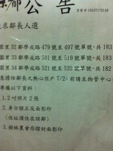 徵求 鄰長人選 公告 7/23(一)/2012報名截止