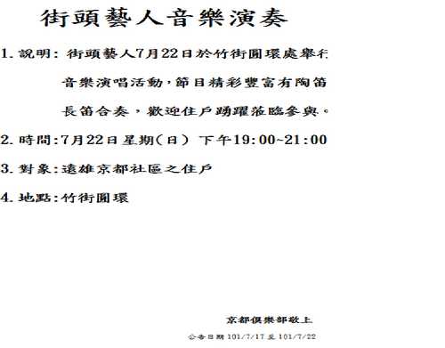 街頭藝人表演 公告 7/22(日)/2102 19:00~21:00