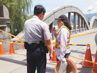 三峽舊橋的橋墩被水沖擊錯移造成橋面裂縫,區公所2日擔心民眾安危,拉起施工用的封鎖線,並貼出「禁止通行」的告示。三峽派出所也支援區公所,一天派出12位員警輪班戒護。員警表示,封橋的1周,有許多民眾不想花時間繞路企圖硬闖,員警只能輪班戒護,增加警方執勤壓力。昨日下午1時,2位區公所的清潔隊員也想闖進橋內,因遭員警的阻擋,還推了員警幾把,讓戒護的員警很無奈。