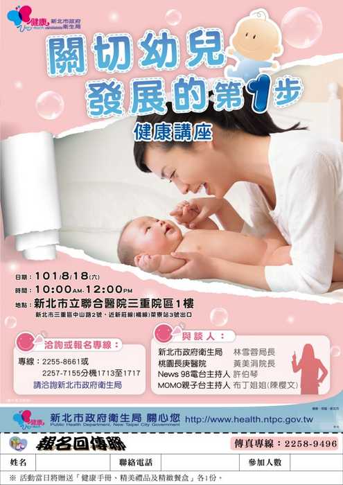 新北市0至6歲的幼兒人口達22萬9千餘人,占全市人口5.86%,較全國5.06%高。本局為協助家有0至6歲幼兒的家長進一步瞭解嬰幼兒不同年齡層的發展階段,將於8月18日(星期六)上午10:00至12:30在新北市立聯合醫院三重院區1樓舉辦「關切幼兒發展的第1步」健康講座,並邀請MOMO親子台主持人布丁姐姐、News98電台主持人許伯琴、桃園長庚醫院黃美涓院長及本局林雪蓉局長座談,現場贈送「新北市民健康活力寶典手冊」、精美小禮物及精緻餐盒。名額有限,歡迎踴躍報名參加。報名專線:2255-8661或2257-7155轉分機1713至1717,傳真報名專線:2258-9496。