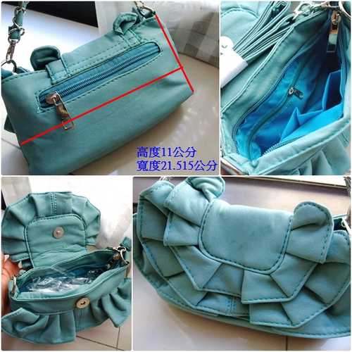 藍綠色的花邊包,因放置一段時間,拿出來時表面皮料可能受潮出現淡斑,便宜買。