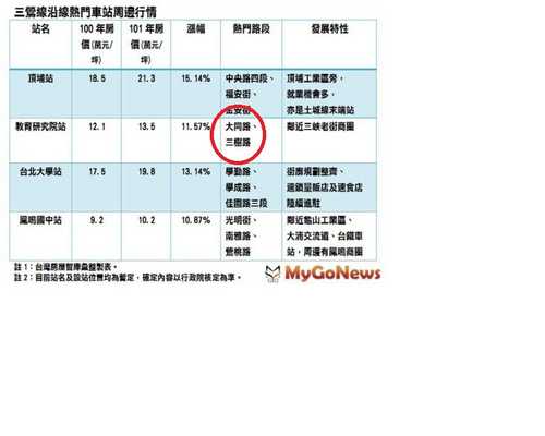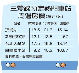 台灣房屋進一步調查目前三鶯線沿線房價,發現包括頂埔站、教育研究院站、台北大學站、鳳鳴國中站等,其實近一年來,都已逆勢上漲,其中又以三鶯線起點、預計2014年通車的頂埔站最為亮眼,年漲幅達15%,其他也都在1成以上。