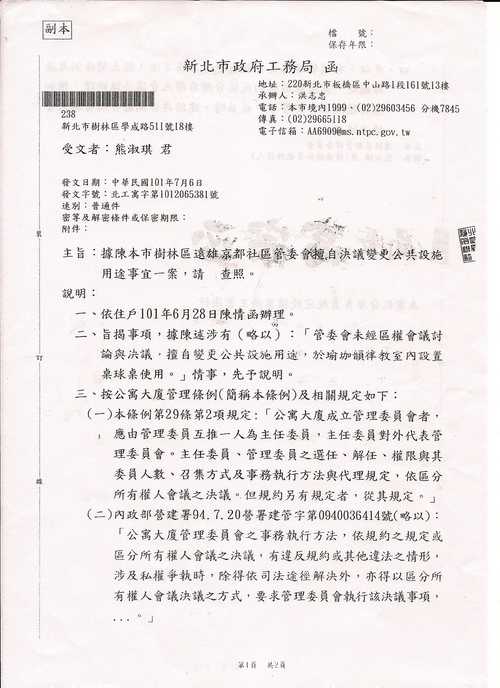 {:7_344:} 8/15的公文也是要管委會逕洽"公寓大廈管理科", 而公寓大廈管理科的結論就是 : 惟如對於規約解釋有異議或管委會決議事項恐有影響住戶權益時, 建請再召開區分所有權人會議決議之.