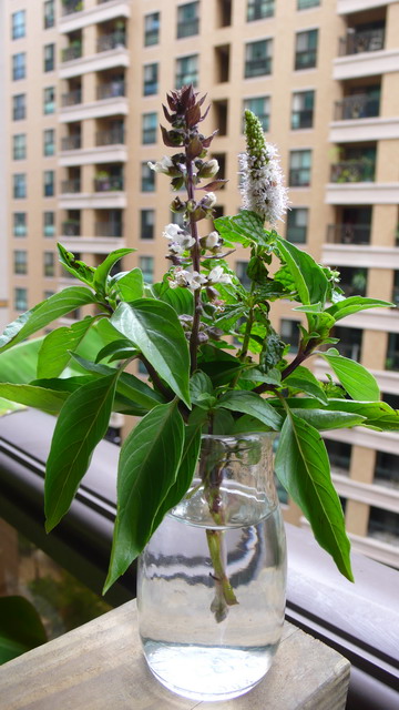 薄荷開花了....九層塔花也從沒停過了....從京都垃圾場撿個小瓶當花瓶....省錢-環保-又美觀....