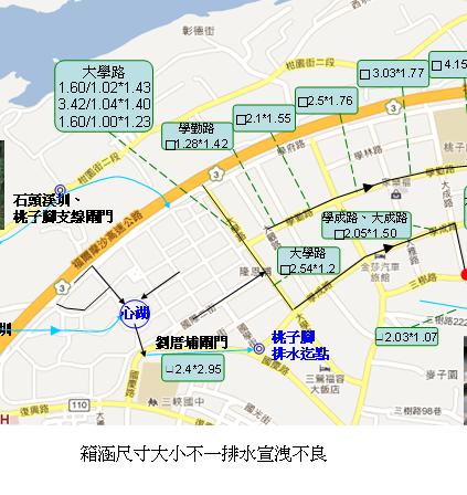 相關改善方案臚分短、中、長期3種方案,其中短期方案係以102年4月底汛期前完成為目標,相關內容大致為新建大學路至學成路口箱涵700公尺長、石頭溪圳與桃子腳支線閘門旁新設排水箱涵1000公尺、請桃園農田水利會於今年8月底前完成重點清疏、請公所加強市區排水路清淤工作及縮短清淤頻率等,俟相關工程、工作完成後,冀望於102年4月底將設施排水標準提高達3年暴雨保護標準(71mm/hr)為目標。